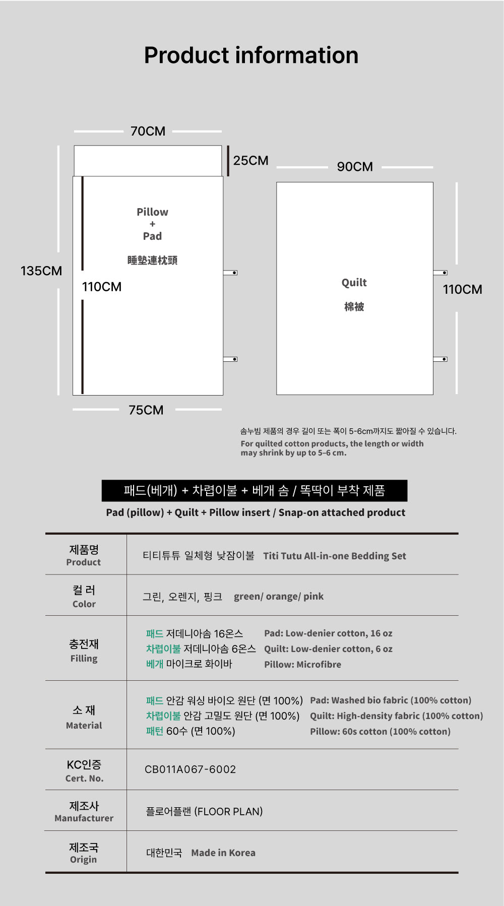 • Pillow: 25 × 70 cm [When the pad is laid on the floor, the combined length of the pad and pillow is 135 cm]